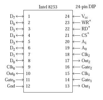 Intel 8253 作為 DIP 封裝,是一個 24 引腳的可程式設計 IC。IC 有三個獨立工作的計數器,寬度為 16 位。此外,我們還有一個控制埠來決定三個計數器的執行模式。它們的物理和功能引腳圖如下所示。