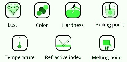 每種物質都有其特徵和性質,如物理性質和化學性質。物質的物理性質不會因物質的任何化學變化而改變,但物質的化學性質會隨著物質的化學變化而改變。物理性質進一步分為**強度性質和廣延性質**。廣延性質取決於物質的數量,而強度性質保持不變,它不依賴於數量和大小。