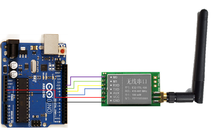 Arduino 和 LoRa 模組之間的連線非常簡單。M0、M1、RXD 和 TXD 需要連線到 4 個 GPIO(我們分別將其連線到 11、10、9 和 8)。Vcc 連線到 5V,GND 連線到 GND。請注意,在 Arduino 上,引腳 8 將是 RX(因為它連線到 LoRa 模組的 TX),引腳 9 將是 TX。