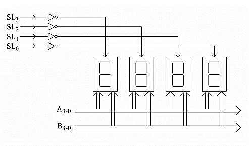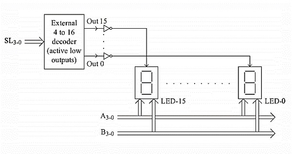 下圖說明了如何在編碼模式下介面共陽極7段LED顯示器。在這個圖中,我們假設連線了16個顯示器。在這種情況下,SL3-0的值從0000更改為1111,因此只有所選顯示器的陽極獲得5V電源,而其他顯示器的陽極獲得0V。