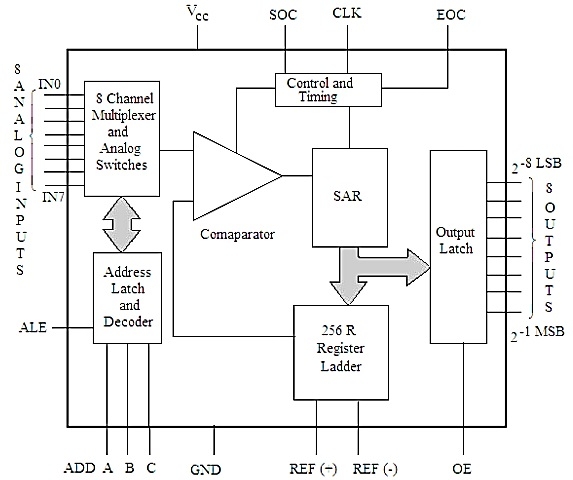 該晶片是一種流行且廣泛使用的 ADC。ADC 0808/0809 是一種單片 CMOS 器件。該器件使用逐次逼近技術將模擬訊號轉換為數字形式。該晶片的主要優點之一是它不需要任何外部零點和滿量程調整,僅需 +5V 直流電源即可。