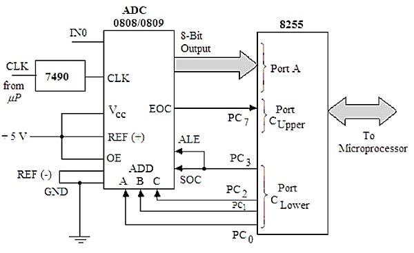 8255 晶片的 PortA 用作輸入埠。Port Cupper 的 PC7 引腳連線到模數轉換器的轉換結束 (EOC) 引腳。此埠也用作輸入埠。Clower 埠用作輸出埠。PC2-0 線路連線到該晶片的三個地址引腳以選擇輸入通道。PC3 引腳連線到 ADC 0808/0809 的轉換開始 (SOC) 引腳和 ALE 引腳。