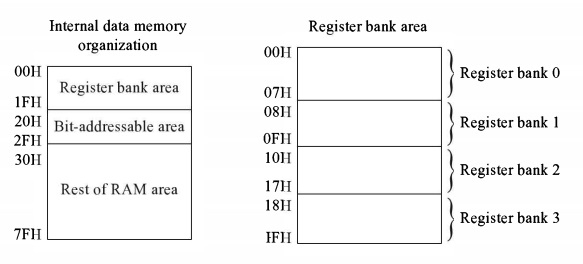 8051 的內部資料儲存器分為兩部分:一組八個暫存器和一個暫存器儲存區。這八個暫存器為 R0 到 R7。地址範圍 00H 到 07H 用於訪問這些暫存器,其餘部分為暫存器儲存區。