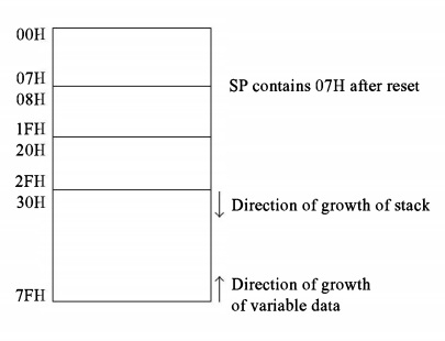 當 8051 復位時,堆疊指標將指向 07H。這意味著位置 08H 到 7FH 可以用作堆疊。我們假設暫存器組 0 正在使用,並且 20H 到 27H 不像位定址區域。
