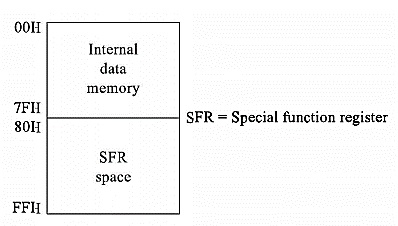 8051 微控制器的內部RAM分為兩部分。第一部分用於暫存器組、位定址記憶體位置、堆疊等。另一部分是SFR(特殊功能暫存器)區域。該微控制器只能使用SFR區域中的21個地址。在這21個位置中,有11個是位定址SFR位置。