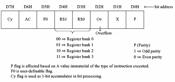 PSW(程式狀態字)基本上是傳統的標誌暫存器。它是位定址SFR。PSW的位元組地址是D0H。雖然位範圍D0H到D7H被認為是PSW,但只有7位有效。