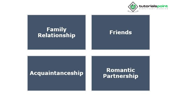 吸引力、熟悉感、共同興趣和相互尊重也發揮著作用。研究表明,身體吸引力是形成浪漫依戀的最重要因素。在一段浪漫關係的開始,一個人的興趣往往集中在潛在伴侶的生理特徵上。當一群人有關係時,它包括所有先前陳述的人際互動形式。存在多種更深層次的關係。在本節中,我們將探討四種不同型別的關係,家庭關係、友誼、熟人關係和浪漫伴侶關係都算在內。