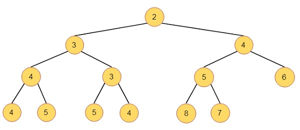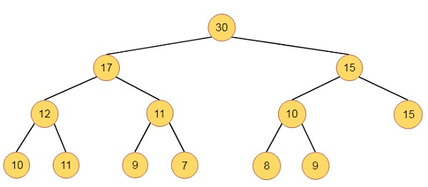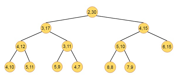 在這裡,我們將瞭解什麼是區間堆。 區間堆是完全二叉樹,其中除了最後一個節點之外的每個節點都包含兩個元素。 令節點 P 中兩個元素的優先順序為“a”和“b”。 這裡我們考慮 a ≤ b。我們說節點 P 表示閉區間 [a, b]。 其中 a 是 P 的區間的左端點,而 b 是右端點。 [c, d] 包含在區間 [a, b] 中當且僅當 a ≤ c ≤ d ≤ b。 在區間堆中,每個節點 P 的左子節點和右子節點表示的區間都包含在 P 表示的區間中。 當最後一個節點包含優先順序為 c 的單個元素時,則 a ≤ c ≤ b。 其中 [a, b] 是最後一個節點的父節點的區間。