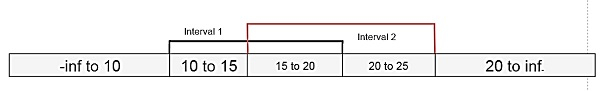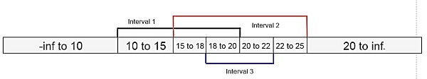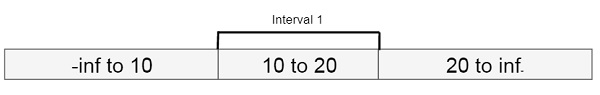 現在假設有一個區間 [10, 20]。因此有三個範圍值。第一個是 -∞ 到 10,10 到 20,最後是 20 到 ∞