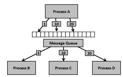 如果我們希望使用不同的資料包進行通訊,例如程序 A 向程序 B 傳送訊息型別 1,向程序 C 傳送訊息型別 10,向程序 D 傳送訊息型別 20。在這種情況下,使用訊息佇列來實現更簡單。為了簡化給定的訊息型別 1、10、20,它可以是 0 或正數或負數,如下所述。