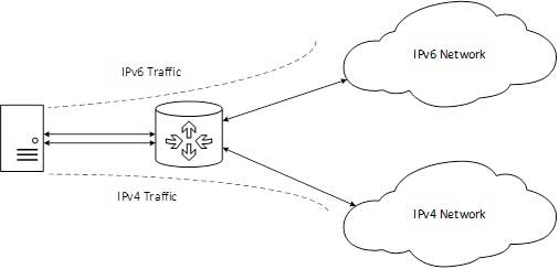 在上圖中,一臺配置了IPv4和IPv6地址的伺服器現在可以藉助雙棧路由器與IPv4和IPv6網路上的所有主機進行通訊。雙棧路由器可以與兩個網路通訊。它為主機在不更改其各自IP版本的情況下訪問伺服器提供了一種方法。