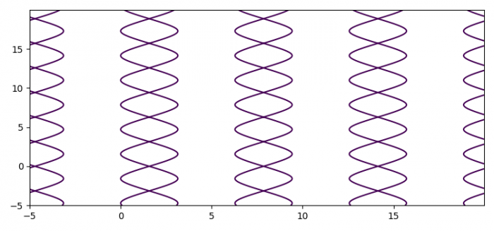 from matplotlib import pyplot as plt import numpy as np plt.rcParams["figure.figsize"] = [7.50, 3.50] plt.rcParams["figure.autolayout"] = True delta = 0.025 xrange = np.arange(-5.0, 20.0, delta) yrange = np.arange(-5.0, 20.0, delta) x, y = np.meshgrid(xrange, yrange) equation = np.sin(x) - np.cos(y)**2 plt.contour(x, y, equation, [0]) plt.show()