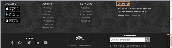driver.execute_script("window.scrollTo(0, document.body.scrollHeight);")讓我們滾動到頁尾並獲取文字 CONTACT US −