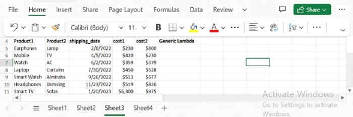 考慮 Excel 工作表。開啟 Microsoft Excel 表格,並將資料從單元格 A4 到 E11 插入到您需要的單元格中,如下所示。