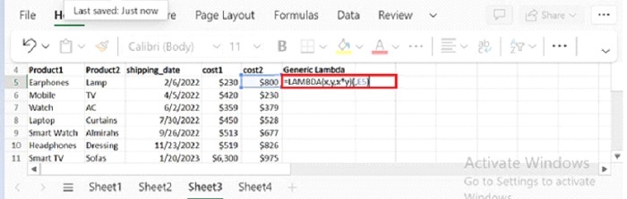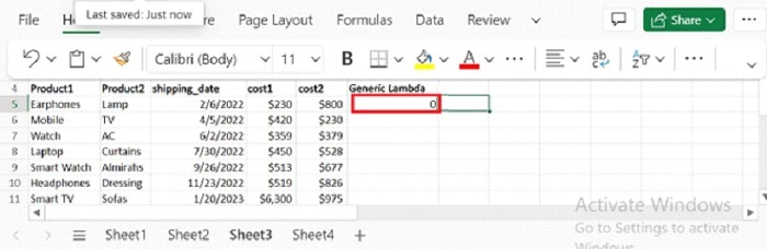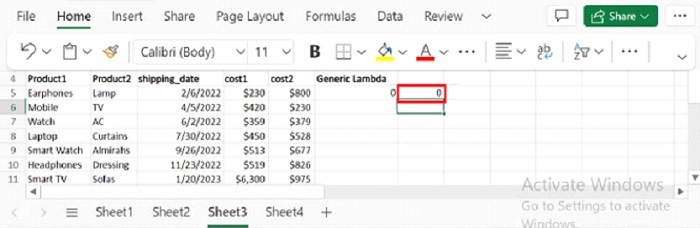 在 Excel 表格中,將指標定位到任何單元格(例如 F5)以計算單元格 E5 中的總成本值,使用者必須檢查該值是否缺失,然後輸入公式以計算單元格 F5 中的成本,即 =LAMBDA(x,y,x*y)(,E5),將其插入到單元格中,然後按 Enter 鍵,這將顯示結果 0,如下所示。