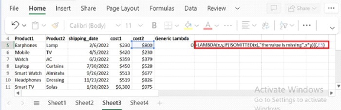 在 Excel 表格中,將指標定位到單元格 G5 並更改公式以檢查 y 引數是否缺失,即 =LAMBDA(x, y, IF(ISOMITTED(y),”值缺失”, x*y))(,E5)。如果 y 引數不存在,則將顯示引數 x 和 y 的乘積。如果不存在,則將返回 0 值,如下所示。