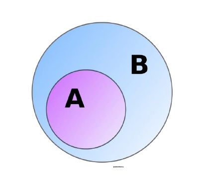 在下圖中,B 是 A 的子集。如果 A 和 B 是相同的集合,則意味著 A 是 B 的真子集。這意味著這兩個集合包含相同的元素。