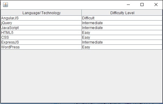 tableModel.insertRow(0, new Object[] { "AngularJS", "Difficult"});現在,如果你需要向上面建立的表中新增一行,請使用addrow()方法 -
