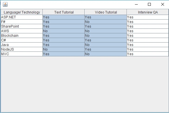 tableModel.addRow(new Object[] { "Blockchain", "Yes", "No", "Yes"});