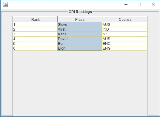 }輸出如下。此處,我們選擇了列。現在,我們可以選擇列了,因為 setColumnSelectionAllowed() 在上文中設定為 TRUE −