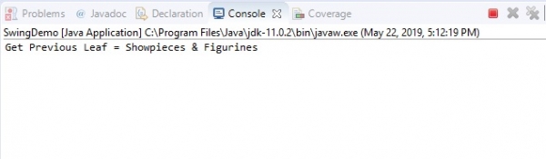System.out.println("Get Previous Leaf = "+eight.getPreviousLeaf());以下是從 JTree 獲取前一個葉子的示例 -