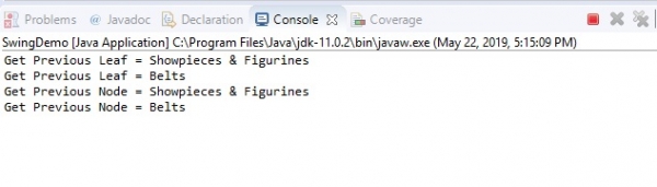 System.out.println("Get Previous Node = "+eight.getPreviousNode());以下是一個從 JTree 中獲取前一個節點的示例 −