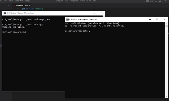 C:\java\javaprgstu>javac cmdprog1.java C:\java\javaprgstu>java cmdprog1 Opening cmd window C:\java\javaprgstu>