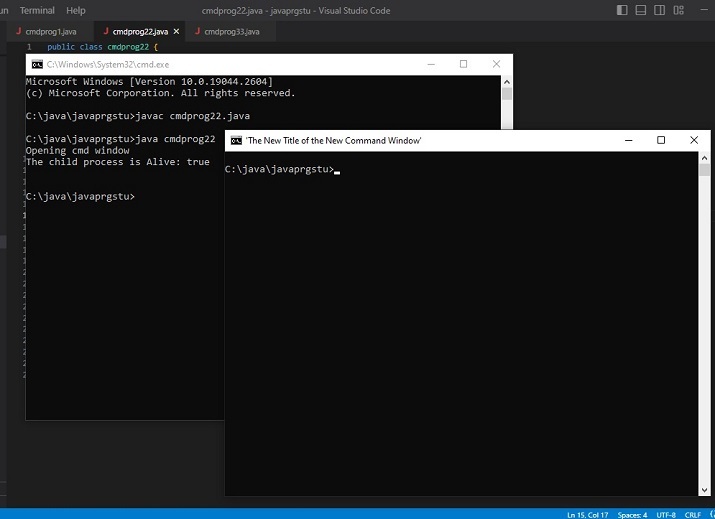 C:\java\javaprgstu>javac cmdprog22.java C:\java\javaprgstu>java cmdprog22 Opening cmd window The child process is Alive: true