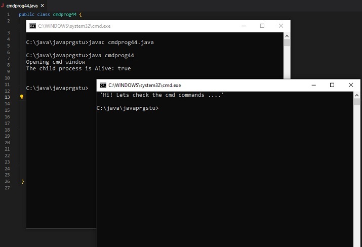C:\java\javaprgstu>javac cmdprog44.java C:\java\javaprgstu>java cmdprog44 Opening cmd window The child process is Alive: true