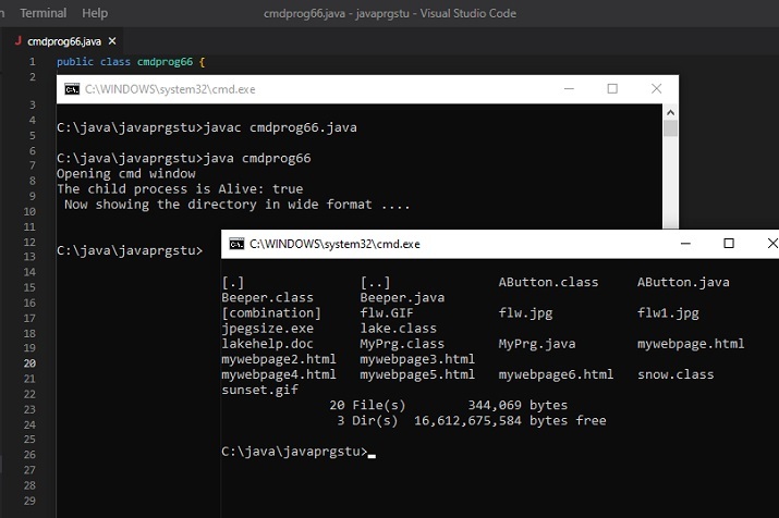 C:\java\javaprgstu>javac cmdprog66.java C:\java\javaprgstu>java cmdprog66 Opening cmd window The child process is Alive: true Now showing the directory in wide format ...