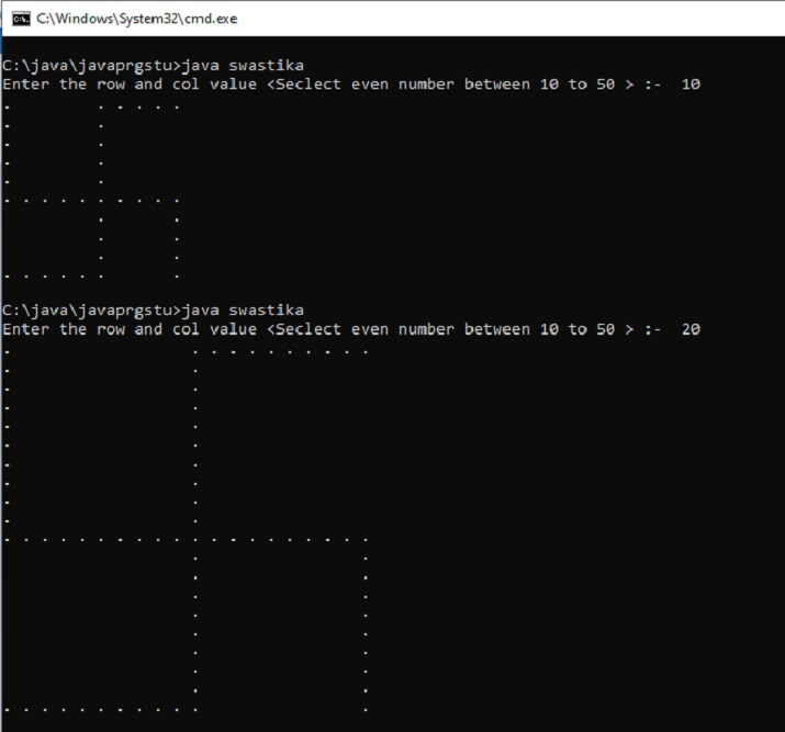 import java.util.Scanner; public class swastika{ public static void main (String[] args){ int n; Scanner sc=new Scanner(System.in); System.out.print("Enter the row and col value <Select a number between 10 to 50 > :- "); n=sc.nextInt(); sc.close(); int row = n, col = n; for (int i = 0; i < row; i++) { for (int j = 0; j < col; j++){ if (i < row / 2){ if (j < col / 2){ if (j == 0) System.out.print("."); else System.out.print(" "+ " "); } else if (j == col / 2) System.out.print(" ."); else{ if (i == 0) System.out.print(" ."); } } else if (i == row / 2) System.out.print(". "); else{ if (j == col / 2 || j == col - 1) System.out.print(". "); else if (i == row - 1){ if (j <= col / 2 || j == col - 1) System.out.print(". "); else System.out.print(" "+ " "); } else System.out.print(" "+" "); } } System.out.print("\n"); } }; }