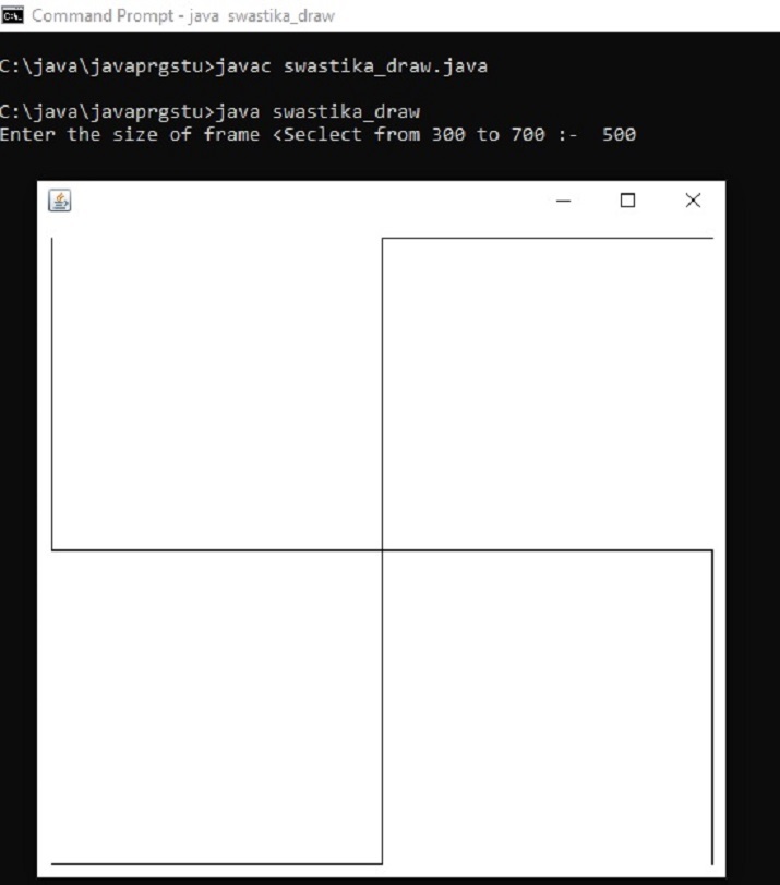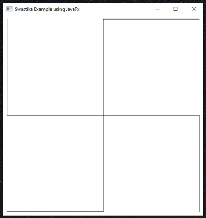 import javafx.application.Application; import javafx.scene.Group; import javafx.scene.Scene; import javafx.scene.shape.Line; import javafx.stage.Stage; public class swastika_draw1 extends Application{ //swastika app starts here.. @Override public void start(Stage stg1) { int x1 = 10; int y1 = 10; int x2 = x1; int y2 = 500/2; int x3 = 500 - 10; int y3 = y2; int x4= x3; int y4= 500 -10; int x5 = x3; int x6 = 500/2; int y5= y1; int y6=y1; int x7=x6; int y7=y4; int x8=x1; int y8=y7; //Creating swastika now.... Line ln1= new Line(x1, y1, x2, y2); Line ln2= new Line(x2, y2, x3, y3); Line ln3= new Line(x3, y3, x4, y4); Line ln4= new Line(x5, y5, x6, y6); Line ln5= new Line(x6, y6, x7, y7); Line ln6= new Line(x7, y7, x8, y8); Group grp1 = new Group(); adding all lines to grp1 grp1.getChildren().add(ln1); grp1.getChildren().add(ln2); grp1.getChildren().add(ln3); grp1.getChildren().add(ln4); grp1.getChildren().add(ln5); grp1.getChildren().add(ln6); //Creating a Scene canvas Scene swastika_canvas = new Scene(grp1, 500, 500); //Set the title of the scene canvas stg1.setTitle("Swastika Example using JavaFx"); //Adding the swastika_canvas to the stg stg1.setScene(swastika_canvas); //Displaying Swastika now... stg1.show(); } //main method starts ... public static void main(String args[]){ launch(args); } }