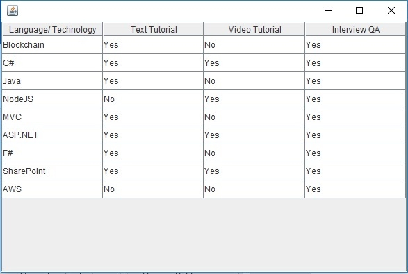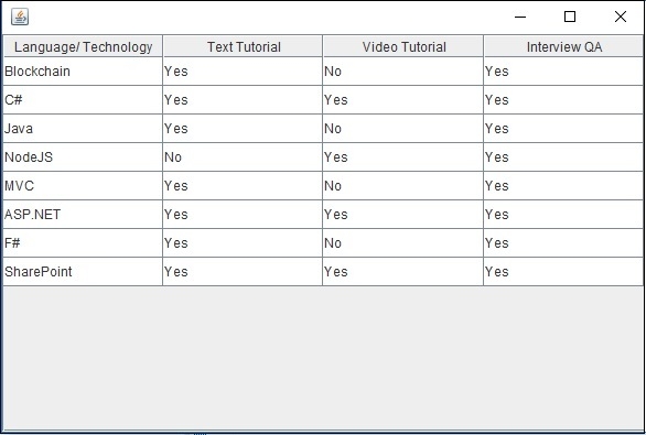 讓我們首先看一個在 JTable 中顯示行和列的示例 −