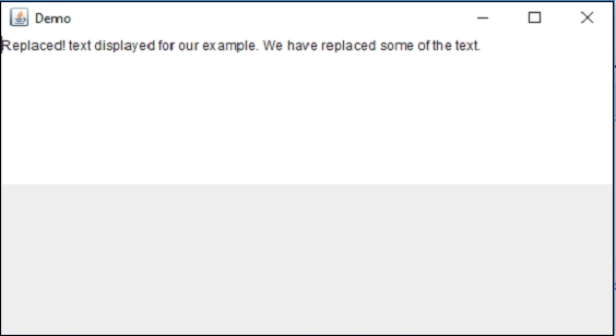 JTextArea textArea = new JTextArea("This is a text displayed for our example. We have replaced some of the text.");現在,替換範圍中的字元 −