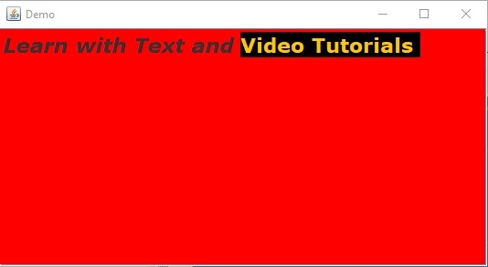 doc.insertString(doc.getLength(), "Video Tutorials ", style);以下是一個使用樣式在 JTextPane 中設定字型和文字顏色的示例 −