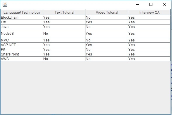 本文中,我們將在Java Swing中建立一個JTable來顯示關於不同程式設計技術及其教程可用性的資訊。表格設定了特定的列和行,每一行包含特定技術的相關資料。我們還演示瞭如何設定表格中單行的高度。具體來說,我們將第4行的行高調整為30畫素,以展示如何在JTable中單獨控制行高。然後,表格將顯示在一個可滾動的JFrame視窗中。