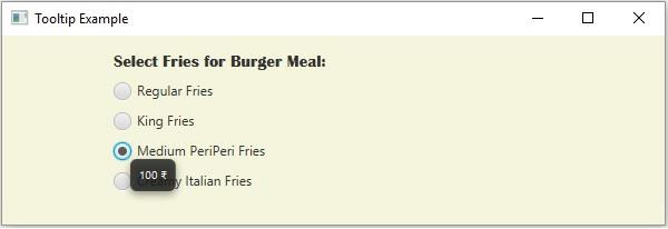 只要在應用程式中將滑鼠指標懸停在某個元素(例如,按鈕、標籤等)上,工具提示就會顯示有關該元素的提示。在 JavaFX 中,工具提示由javafx.scene.control.Tooltip類表示,您可以透過建立它來建立一個工具提示。
