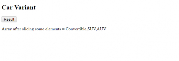 document.getElementById("test").innerHTML = "Array after slicing some elements = "+car.slice(1,4);