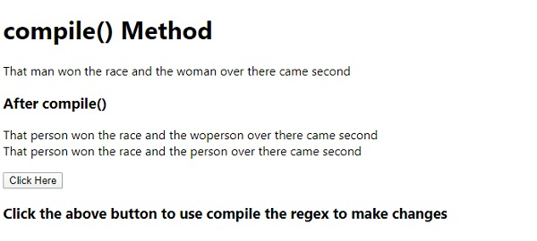 JavaScript compile() 方法用於在指令碼執行期間編譯正則表示式。它在 JavaScript 1.5 版本中棄用。