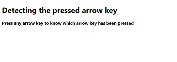 <!DOCTYPE html> <html lang="en"> <head> <meta charset="UTF-8" /> <meta name="viewport" content="width=device-width, initial-scale=1.0" /> <title>Document</title> <style> body { font-family: "Segoe UI", Tahoma, Geneva, Verdana, sans-serif; } .sample { font-size: 18px; font-weight: 500; } </style> </head> <body> <h1>Detecting the pressed arrow key</h1> <div class="sample"></div> <h3> Press any arrow key to know which arrow key has been pressed </h3> <script> let fillEle = document.querySelector(".sample"); document.body.addEventListener("keydown", (event) => { switch (event.keyCode) { case 37: fillEle.innerHTML = "Left key pressed"; break; case 38: fillEle.innerHTML = "Up key pressed"; break; case 39: fillEle.innerHTML = "Right key pressed"; break; case 40: fillEle.innerHTML = "Down key pressed"; break; } }); </script> </body> </html>