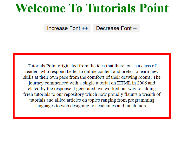 在下面的示例中,我們建立了一個簡單的div程式並建立了兩個按鈕,即“增大”和“減小”。我們使用這兩個函式來增大div的字型,並使用“減小”按鈕來減小div的字型。