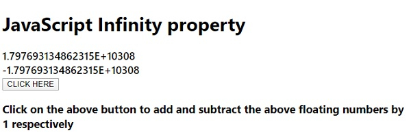 如果浮點數超過最大限制,JavaScript 無窮大屬性會顯示無窮大;如果浮點數低於最小限制,則會顯示負無窮大。