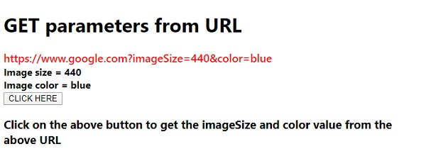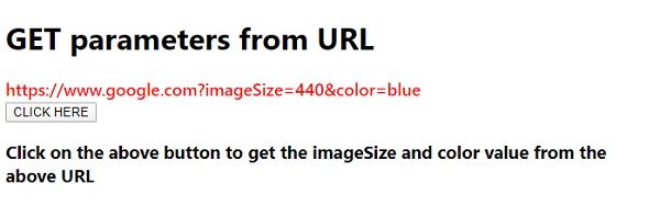 <!DOCTYPE html> <html lang="en"> <head> <meta charset="UTF-8" /> <meta name="viewport" content="width=device-width, initial-scale=1.0" /> <title>Document</title> <style> body { font-family: "Segoe UI", Tahoma, Geneva, Verdana, sans-serif; } .sample { font-size: 18px; font-weight: 500; color: red; } </style> </head> <body> <h1>GET parameters from URL</h1> <div class="sample">https://www.google.com?imageSize=440&color=blue</div> <div style="font-weight: bold;" class="result"></div> <button class="Btn">CLICK HERE</button> <h3> Click on the above button to get the imageSize and color value from the above URL </h3> <script> let sampleEle = document.querySelector(".sample"); let resultEle = document.querySelector(".result"); var url = new URL(sampleEle.innerText); var urlParams = url.searchParams; var imageSize = urlParams.get("imageSize"); var color = urlParams.get("color"); document.querySelector(".Btn").addEventListener("click", () => { resultEle.innerHTML += 'Image size = ' + imageSize + '<br>' + 'Image color = ' + color; }); </script> </body> </html>