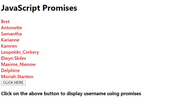 <!DOCTYPE html> <html lang="en"> <head> <meta charset="UTF-8" /> <meta name="viewport" content="width=device-width, initial-scale=1.0" /> <title>Document</title> <style> body { font-family: "Segoe UI", Tahoma, Geneva, Verdana, sans-serif; } .sample { font-size: 18px; font-weight: 500; color: red; } </style> </head> <body> <h1>JavaScript Promises</h1> <div class="sample"></div> <button class="Btn">CLICK HERE</button> <h3> Click on the above button to display username using promises </h3> <script> let sampleEle = document.querySelector(".sample"); document.querySelector(".Btn").addEventListener("click", () => { fetch("https://jsonplaceholder.typicode.com/users") .then((response) => response.json()) .then((result) => { result.forEach((element) => { sampleEle.innerHTML += element.username + "<br>"; }); }) .catch((err) => alert(err)); }); </script> </body> </html>