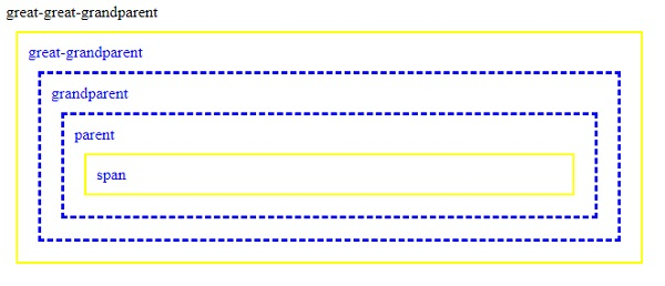 $("span").parentsUntil("div").css({"color": "blue", "border": "3px dashed blue"});