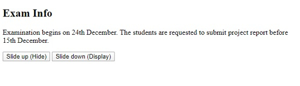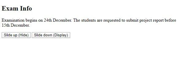 ด้านบน พารามิเตอร์ความเร็วคือความเร็วของเอฟเฟกต์การเลื่อน ในที่นี้ easing คือความเร็วขององค์ประกอบในแต่ละจุดของการเคลื่อนไหว ขณะที่แคลลแบ็กเป็นฟังก์ชันที่จะดำเนินการหลังจาก slideUp() เสร็จสิ้น