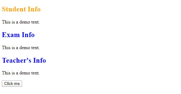 <!DOCTYPE html> <html> <head> <script src="https://ajax.googleapis.com/ajax/libs/jquery/3.4.1/jquery.min.js"></script> <script> $(document).ready(function(){ $("button").click(function(){ $("h2").not(".demo").css("color", "orange"); }); }); </script> <style> h2 { color: blue; } </style> </head> <body> <h2>Student Info</h2> <p>This is a demo text.</p> <h2 class="demo">Exam Info</h2> <p>This is a demo text.</p> <h2 class="demo">Teacher's Info</h2> <p>This is a demo text.</p> <button>Click me</button> </body> </html>