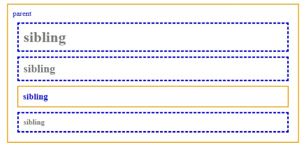 <!DOCTYPE html> <html> <head> <style> div { width:600px; } .demo * { display: block; border: 2px solid orange; color: blue; padding: 10px; margin: 10px; } </style> <script src="https://ajax.googleapis.com/ajax/libs/jquery/3.4.1/jquery.min.js"></script> <script> $(document).ready(function(){ $("h3").next().css({"color": "gray", "border": "3px dashed blue"}); }); </script> </head> <body class="demo"> <div> parent <h1>sibling</h1> <h2>sibling</h2> <h3>sibling</h3> <h4>sibling</h4> </div> </body> </html>