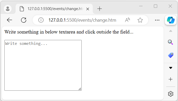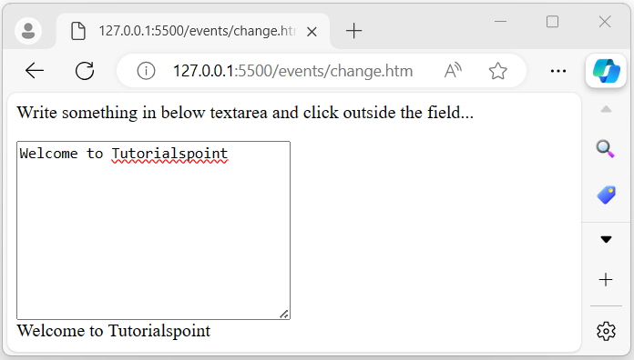 在此示例中,我們透過將事件處理程式附加到選定textarea欄位的 change 事件來演示 jQuery change() 方法。當用戶在文字區域中輸入內容,然後單擊文字區域外部時,輸入的文字將立即顯示在文字區域旁邊: