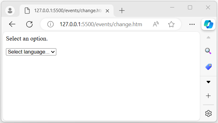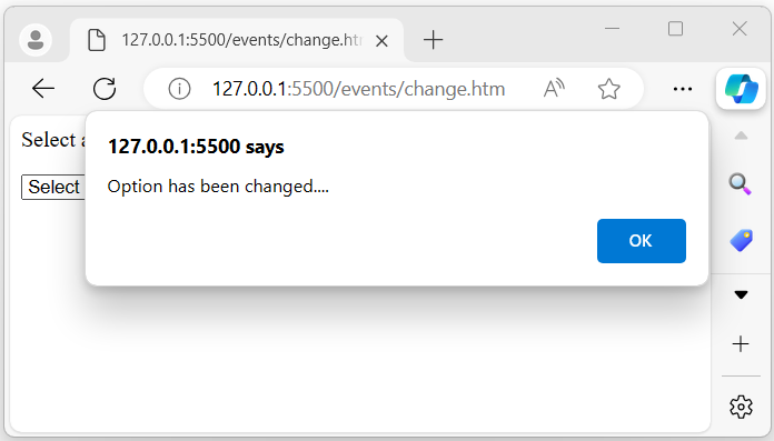 執行上述程式後,它將顯示一個 select 欄位。當用戶選擇一個選項時,將發生 change 事件(在選擇選項之前):